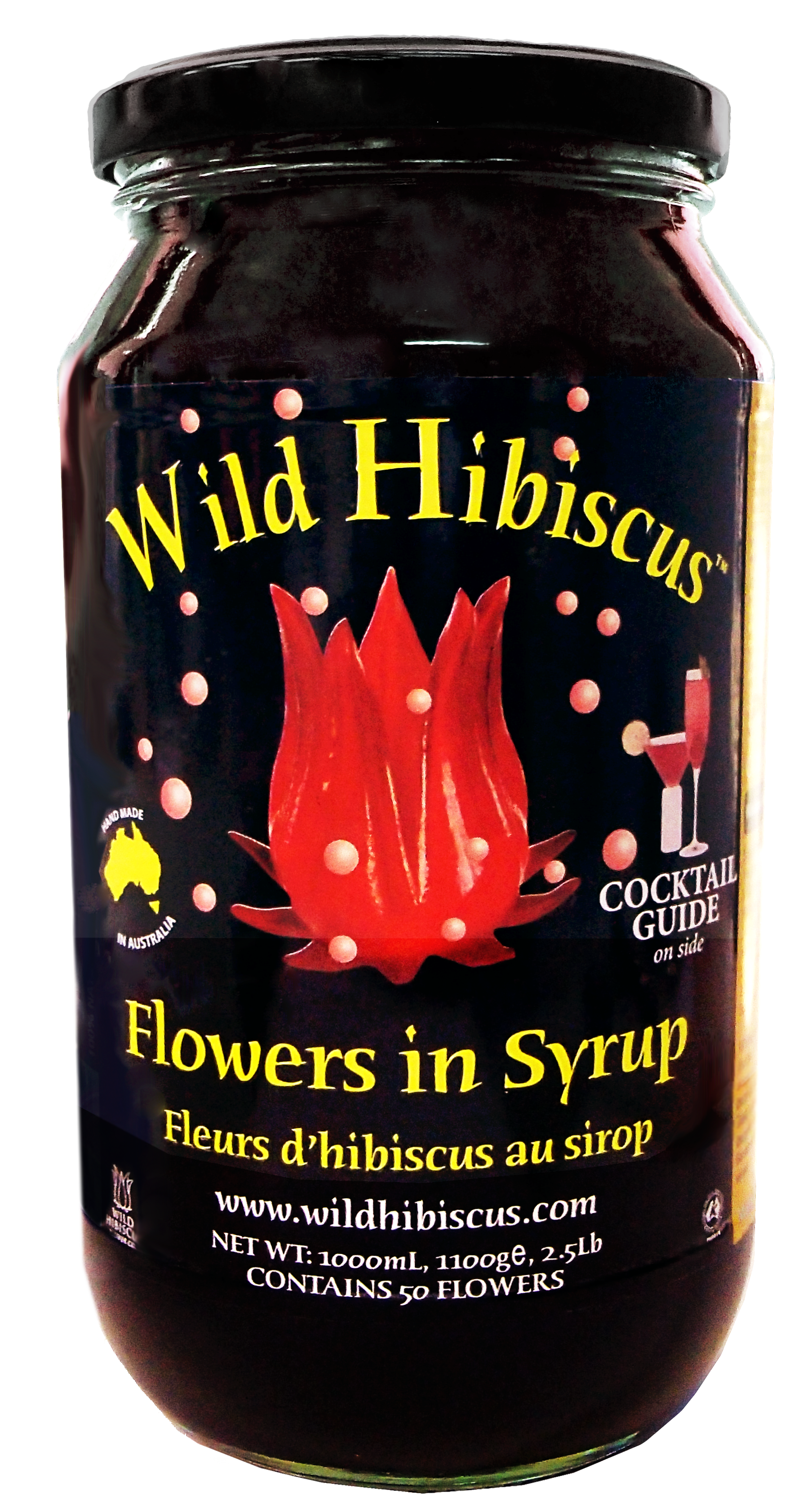 - A beautifully presented jar containing whole Wild Hibiscus Flowers in Syrup.
